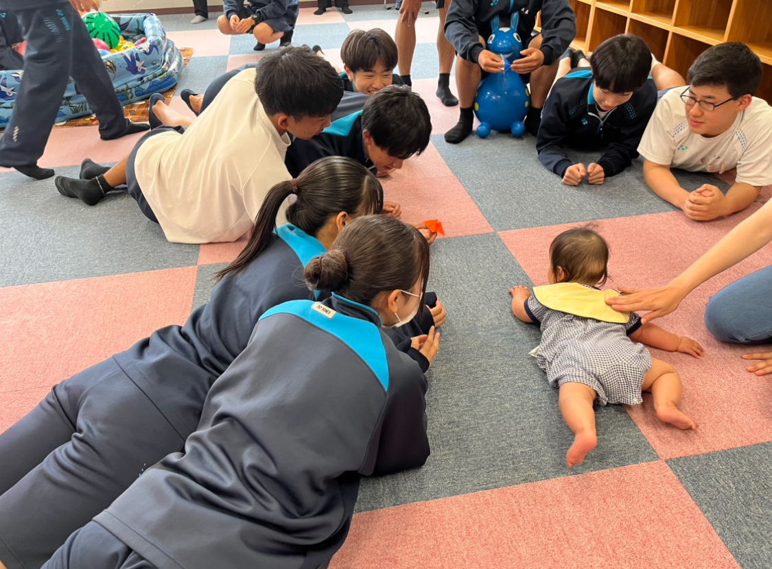 高校生は事前学習で保育人形を抱っこした時とは全く違う子供たちの反応に戸惑いながら同じ時間を過ごしました。