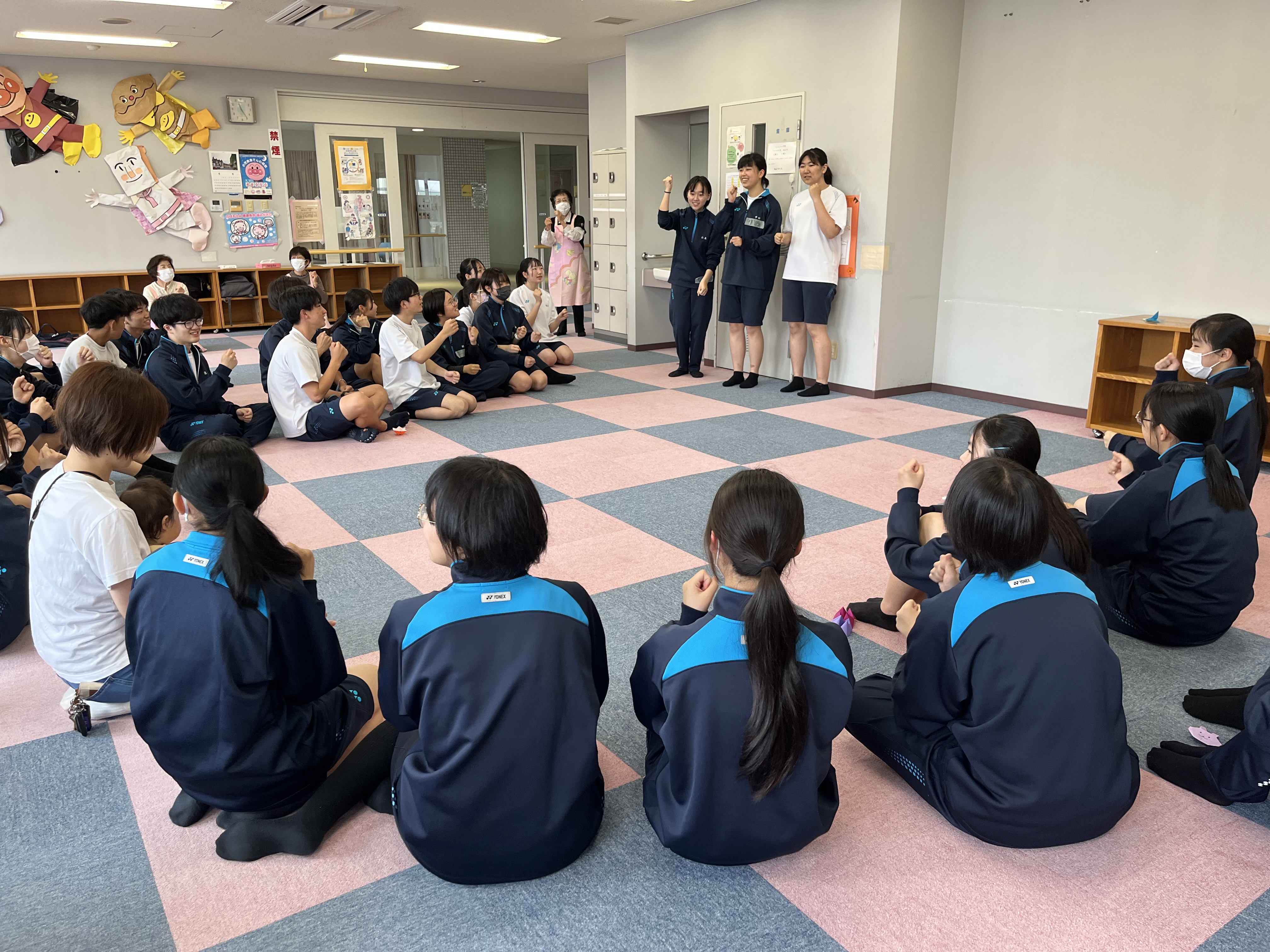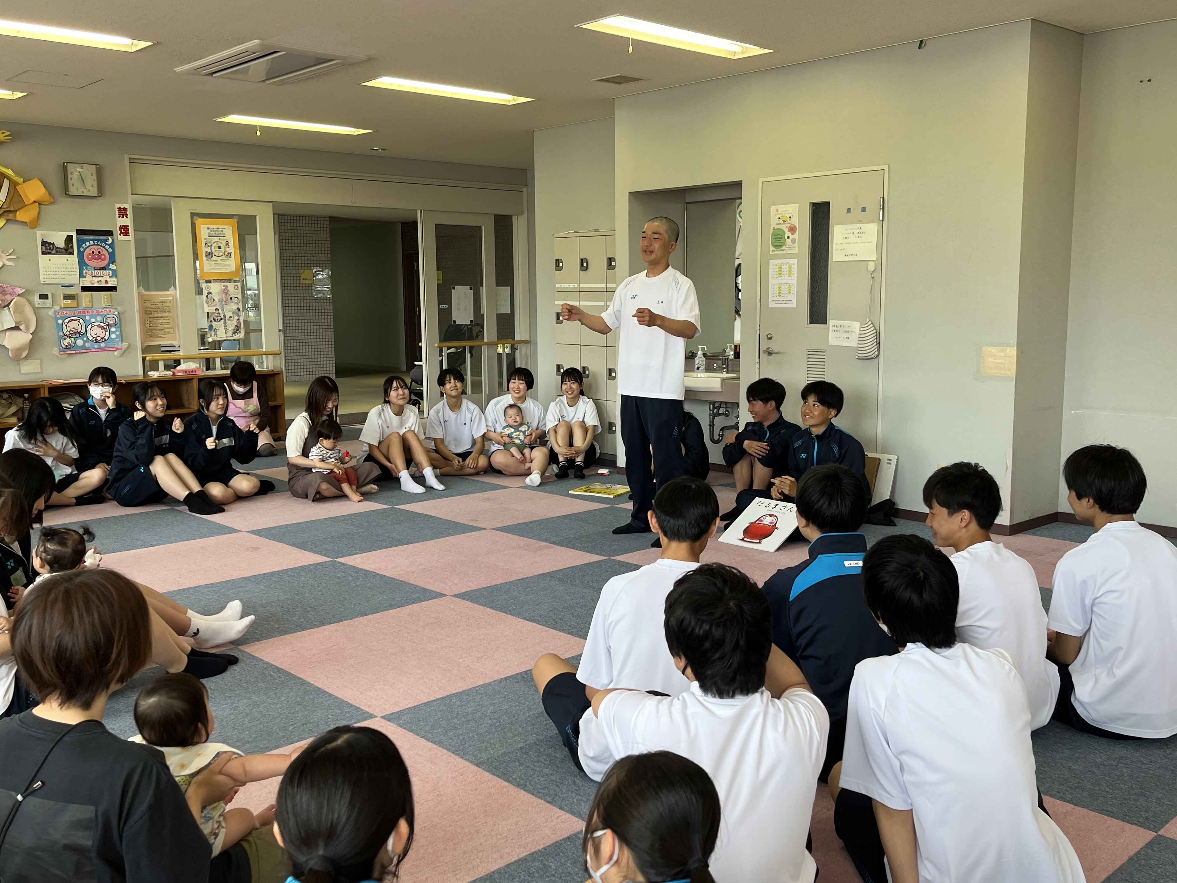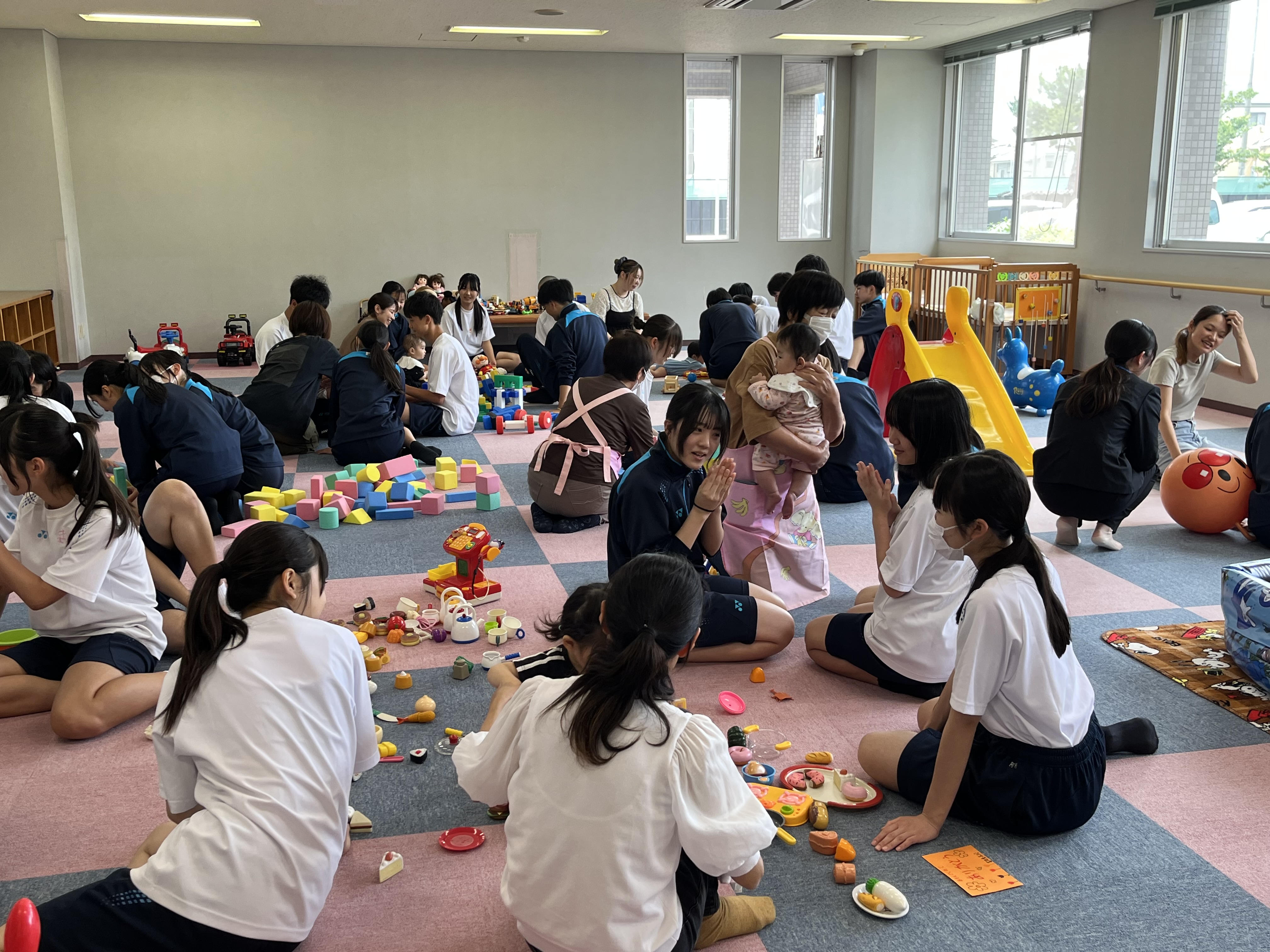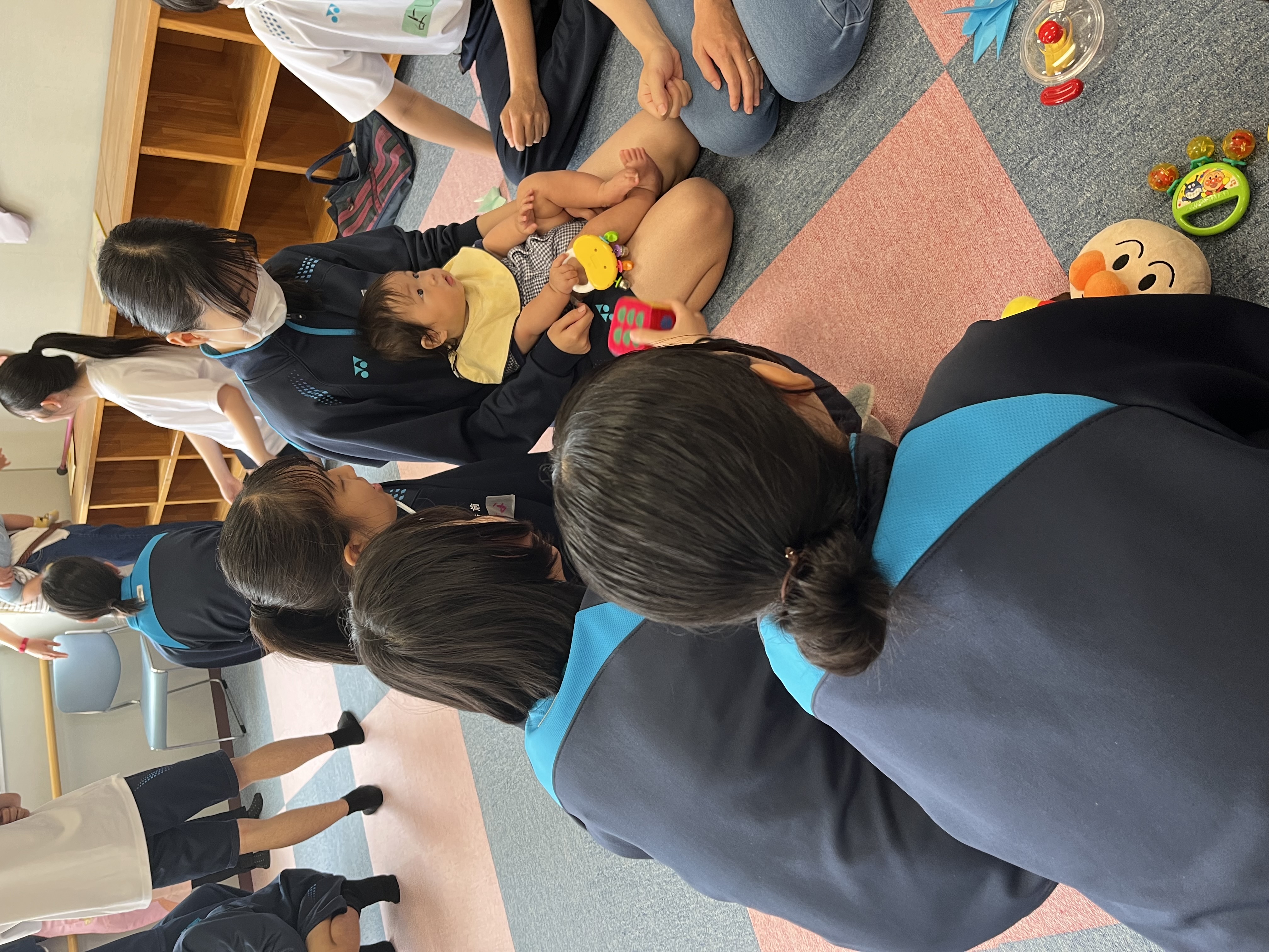 同じおもちゃで遊んだり、抱っこさせてもらったり、有意義な時間を過ごすことができました。最後に高校生3人がみんなを代表して手遊び歌を披露しておしまいになりました。